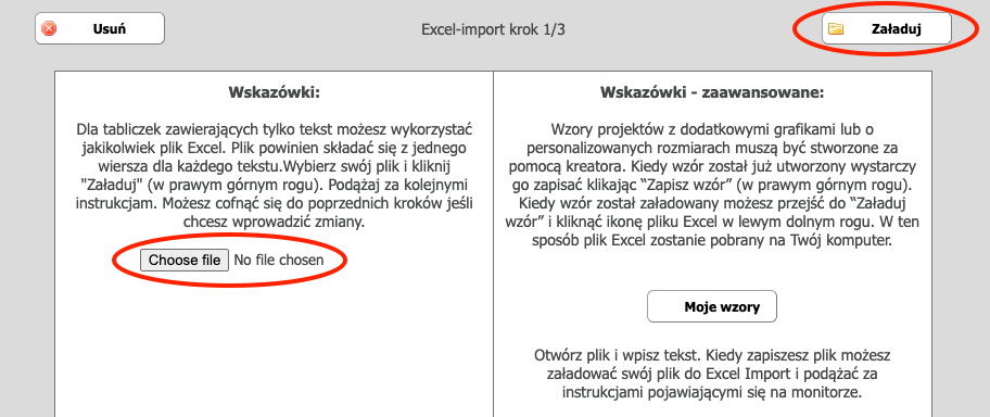 Kliknij Wybierz plik, znajdź odpowiedni plik Excel na swoim komputerze, następnie kliknij Otwórz oraz Załaduj.