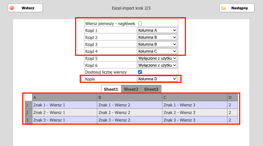 Jeśli w arkuszu znajduje się informacja o ilość kopii wybierz odpowiednią nazwę kolumny w sekcji Kopie.