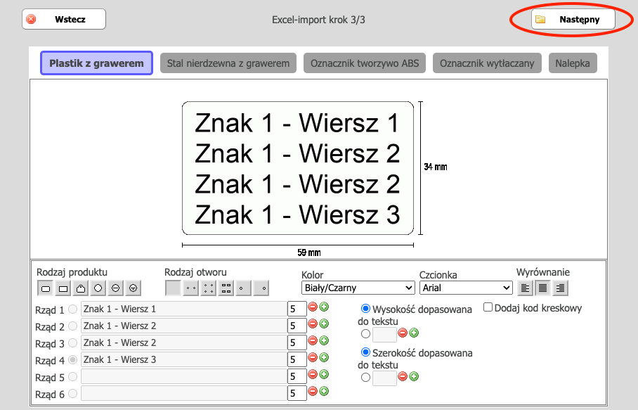 W przypadku w którym pojawi się komunikat, że nie wszystkie znaki zostały zaimportowane oznacza to że tekst nie jest dopasowany. Rozwiązanie tej sytuacji jest proste - należy zmniejszyć czcionkę lub powiększyć znak. Kiedy wszystkie parametry się zgadzają - kliknij Następny i Zakończ.
