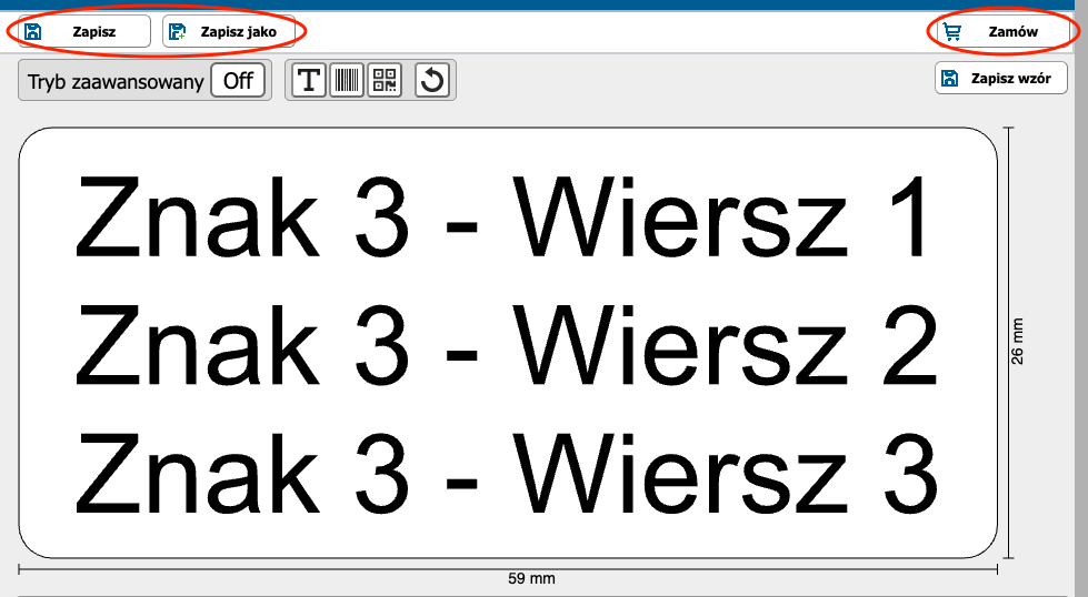 Przykład: Na przykładzie z grafiki pokazane jest tworzenie arkusza pod wykonanie 3 znaków o tym samym wyglądzie lecz innej zawartości tekstowej. Każdy ze znaków zawierać będzie 3 linie tekstu. Każdy ze znaków posiadał będzie również 2 kopie.