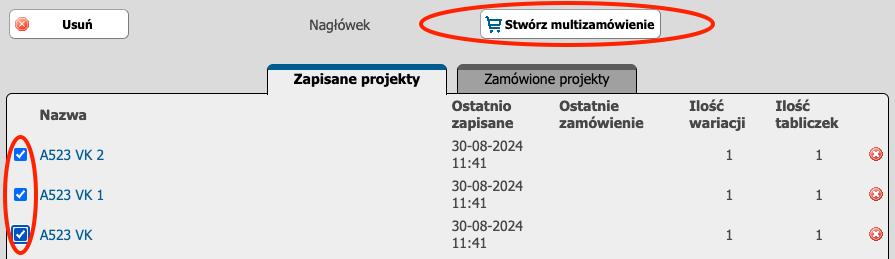 Kliknij Otwórz aby dotrzeć do projektów zapisanych na Twoim koncie. Odchacz foldery z projektami które chcesz zamówić po czym kliknij Stwórz multizamówienie.