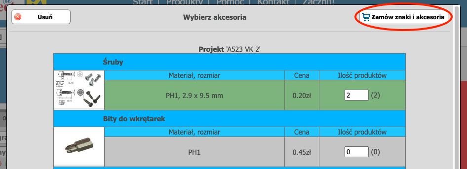 Dodaj (lub nie) akcesoria według swojego uznania. Po wykonaniu tego kroku Zamów znaki i akcesoria.