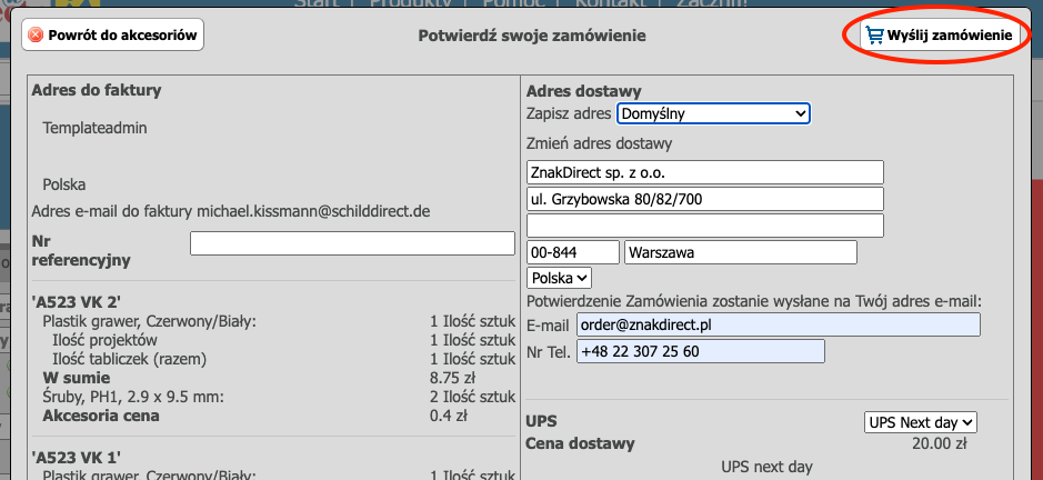 Następny krok w procesie zamawiania to podsumowanie i finalizacja zamówienia. Warto mieć na uwadze, że zamówione tabliczki i oznakowania produkowane są niemal niezwłocznie po zarejestrowaniu zamówiania i wysyłane tego samego dnia, natomiast faktura za zamówienie dotrze do Ciebie osobno w terminie do dwóch tygodni od złożenia zamówienia.