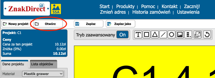 Kliknij na Otwórz aby przejść do sekcji gdzie zapisane są wszystkie foldery z Twoimi projektami. Sekcja dzieli się na dwie zakładki - Zapisane projekty oraz Zamówione projekty.