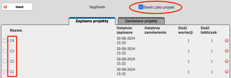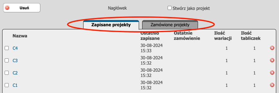 Zakładka Zapisane projekty zawiera wszystkie projekty które zostały stworzone i zapisane. Zakładka Zamówione projekty zawiera projekty które zostały zamówione z danego konta klienta.