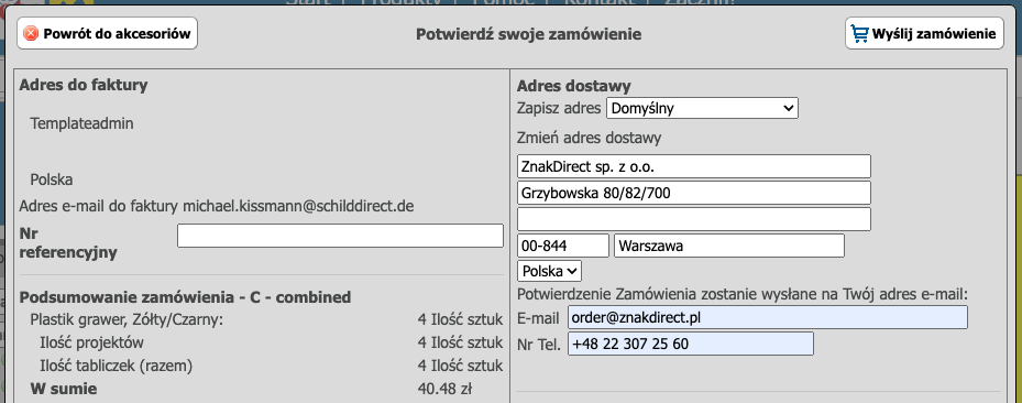 W kolejnym kroku sfinalizuj zamówienie potwierdzając szczegóły danych do wysyłki. Warto mieć na uwadze, że zamówione tabliczki i oznakowania produkowane są niemal niezwłocznie po zarejestrowaniu zamówiania i wysyłane tego samego dnia, natomiast faktura za zamówienie dotrze do Ciebie osobno w terminie do dwóch tygodni od złożenia zamówienia.