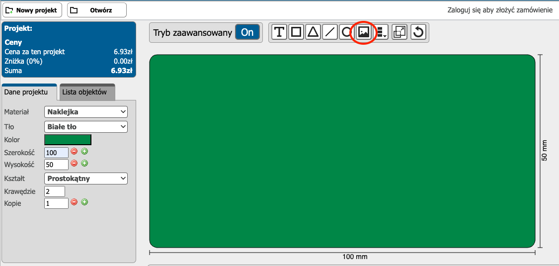 Zaloguj się i kliknij przycisk Zamów w dowolnym miejscu na stronie głównej aby otworzyć narzędzie internetowe. Z tego punktu możesz rozpocząć tworzenie wzoru i dodawać grafiki.