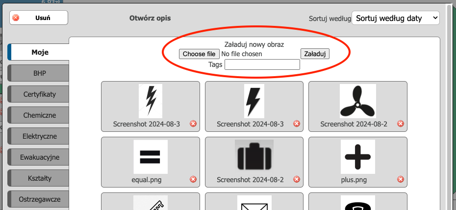 Kiedy chcesz użyć dodaną przez siebie wcześniej grafikę kliknij Dodaj obraz na pasku narzędzi. Przejdź do odpowiedniej zakładki i kliknij w grafikę którą chcesz umieścić na projekcie.