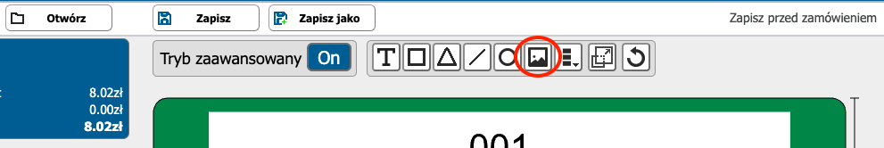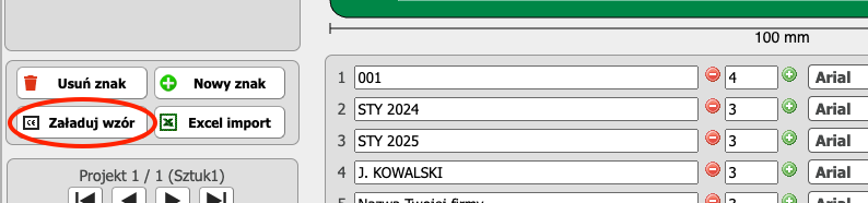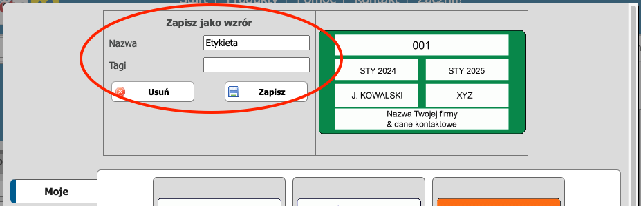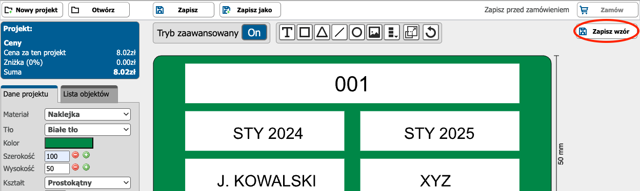 Stworzyłeś projekt swojej tabliczki i chciałbyś zachować wzór na przyszłość do modyfikacji? Użyj opcji Zapisz wzór pamiętając aby z żadnych elementów na podglądzie.