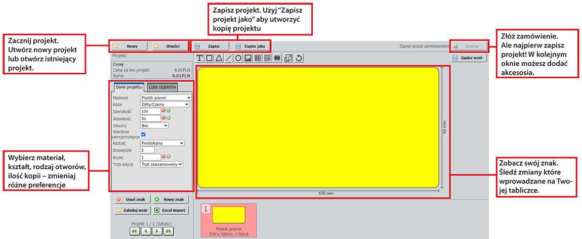 Pojedyńczy projekt może zawierać kilka różnych rodzajów tabliczek. Możesz zapisać swoje projekty i wykorzystać je później.